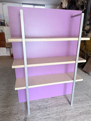 Estantería de pared con un diseño moderno y funcional. - Panel trasero de color morado. - Base de madera en tono beige. - Soporte central metálico. Se encuentra como nuevo , lo quito porque estoy cambiando mi habitacion