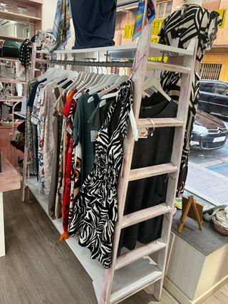 Perchero con una estructura combinada de madera y metal. - Diseño moderno y funcional. - Base estable para colgar ropa.