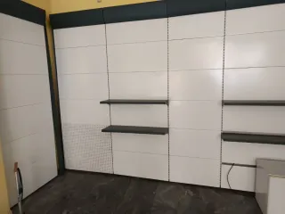 Sistema de estanterías y paneles para negocios. Ideal para organizar y exhibir productos. - Paneles de pared blancos. - Estantes metálicos ajustables. - Perfiles superiores en color verde