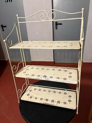 Elegante estantería de hierro forjado con un diseño clásico y un jarrón de cristal. - Estructura de metal resistente. - Diseño de cuatro niveles. - Incluye jarrón de cristal. Esta en Punta Umbria