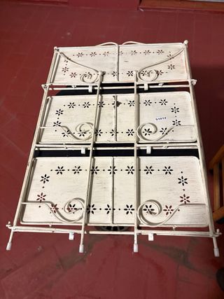 Estantería plegable de metal con un diseño decorativo. - Tres niveles. - Acabado en color beige y blanco. - Patrones de flores caladas en cada bandeja. - Medidas aproximadas