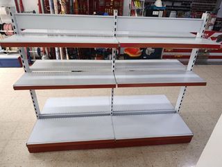 Estanterías exposicion blancas de metal galbanizado, doble cara, con borde en color rojo.
