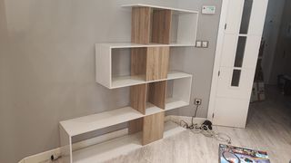 Bonita estantería de diseño en zigzag, perfecta para cualquier habitación. Está en muy buen estado. La estantería está en buen estado, se vende desmontada en mano en mano en Madrid y alrededores - Diseño moderno y elegante. - Combina colores blanco y marrón. - Estructura resistente y estable. - Ideal para organizar libros, objetos decorativos, etc.