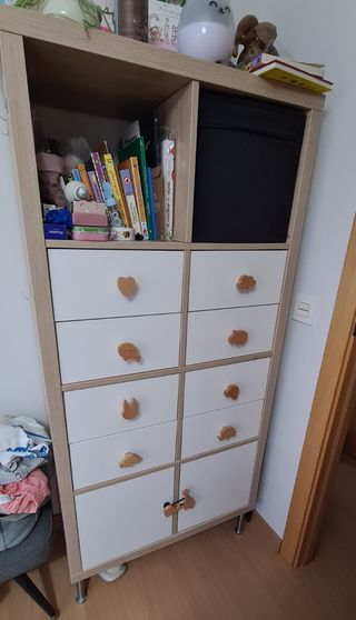 Estantería Kallax en color madera claro, con accesorio de 4 cajoneras mas 2 puertas. Se incluye tambien las patas metalicas. Los tiradores serían los metálicos originales, no los de la foto. El valor de nueva seria de unos 170€, ya qur as cajoneras se venden por 20€/ud y las puertas en 15€/ud. En un lateral tiene 3 colgadores de pegatina, no con tornillos(ver foto) - Combina espacios abiertos con cajones y puertas. - Tiradores originales metálicos, no los de la foto - Patas metálicas para mayor estabilidad.
