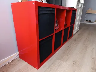 Estantería modular de 8 cubos, perfecta para organizar tu espacio. - Diseño de 4 columnas por 2 filas. - Acabado en exclusivo color rojo vibrante. - Fabricada en madera resistente. - Tiene alguna pequeña marca mostrada en imagen La recogida sería para finales de Octubre / primeros de Noviembre