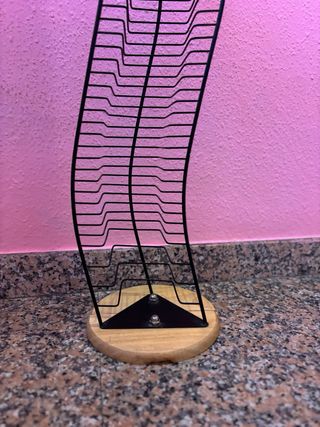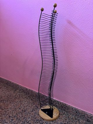 Estantería vertical para CDs con un diseño ondulado. Fabricada en metal negro. Base de madera. Altura: 90cm. Tiene capacidad para 58 CD’s.