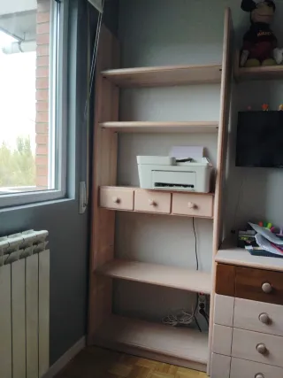 Estantería de madera maciza con un diseño sencillo y funcional. - Estructura robusta. - Acabado en tonos madera natural. eEs una estantería de habitación, con 5 baldas. Muchas capacidad. Es súper resitene puesto que es madera maciza. Lleva tres cajones en el medio. No sé aprecia en las fotos pero es muy bonita. La vendo con un sinfonier. Sola 60. El sinfonier y la estantería 150.