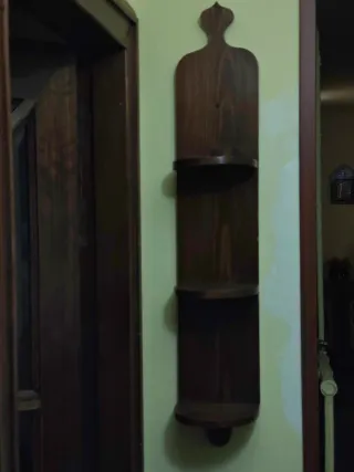 Repisa de madera con un diseño vertical y tres estantes. - Aproximadamente 1 metro de alto. - Aproximadamente 15 cm de ancho. - Acabado en tono oscuro.