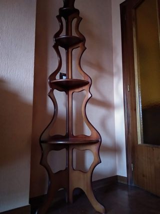 Elegante estantería de madera con un diseño clásico. - Tres niveles para exhibir objetos. - Patas talladas con detalles decorativos. - Acabado en tono oscuro.