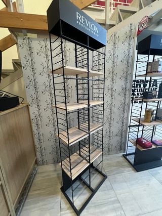 Estantería de exposición de la marca Revlon. - Estructura principal de metal. - Estantes de madera. - Diseño de 5 niveles. Hay 4 unidades Precio final por todas 120€