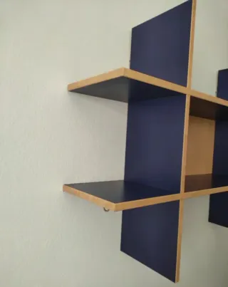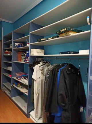 3 Estanterías de formica postformada. Costados en azul grisáceo. Medidas: 2 estanterías de 1,05 de ancho y40 de fondo con 7 y 9 baldas cada una. Otra de1,34 de ancho por 40 de fondo con 4 baldas más barra para perchero. - Diseño moderno y funcional. - Acabado resistente y fácil de limpiar. El precio es de 295 € las tres