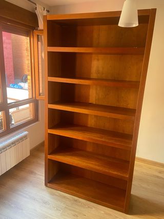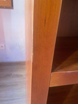 Estantería de madera maciza con varios estantes. Tiene algún desperfecto que se muestra en las fotos. SE VENDE DESMONTADA.