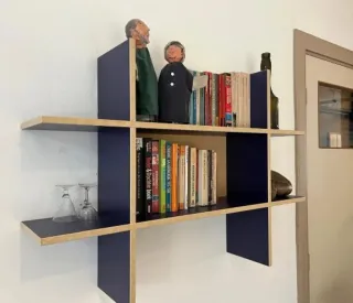 Estantería de diseño moderno con forma de cubo. Se encuentra en buen estado y es ideal para organizar tus objetos. - Acabado liso y brillante. - Bordes redondeados.