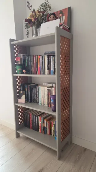 Estantería de madera con un diseño único de celosía en los laterales. Ideal para organizar libros y objetos decorativos. - Diseño de celosía en los laterales. - Estructura de madera robusta.