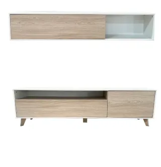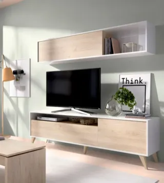 Conjunto de muebles de salón de diseño moderno, ideal para crear un espacio acogedor y funcional. - Acabado en madera clara y blanco. - Estantería superior con compartimento cerrado. - Mueble bajo con cajones y espacio para electrónica. - Patas de madera inclinadas. *Entrega en León y rededores*