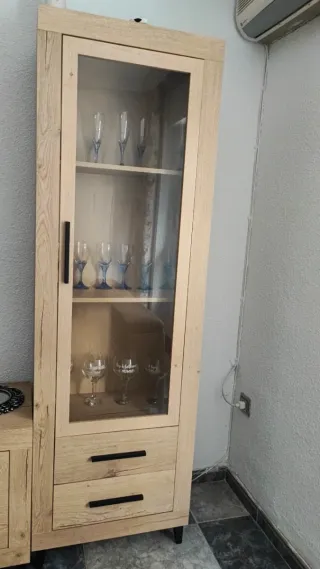 Conjunto de muebles de salón que incluye mueble de televisión, vitrina y estantería. - Diseño moderno en madera. - Vitrina con puertas de cristal. - Estantería flotante. El comprador tendrá que tener medios para desmontarlo (atornillador) y llevárselo.
