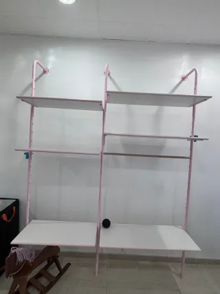 12.5 metros de conjunto de estanterías para negocio. - Color blanco con detalles en rosa. - Fabricadas en madera y plástico. Hay de 60cm, de 80cm y de 1 metro. Porte disponible. Pregunte presupuesto
