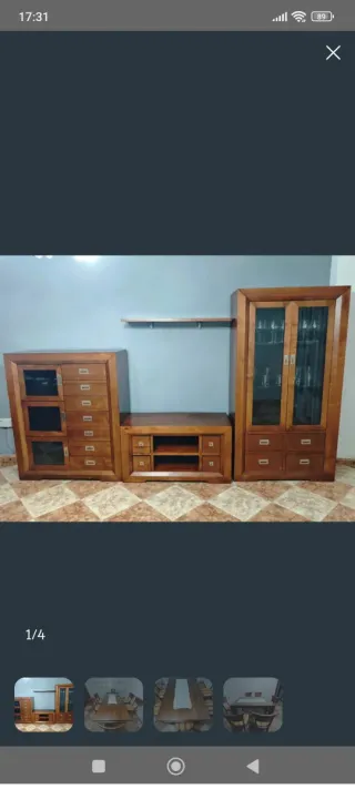 Vendo conjunto completo de muebles de salón en buen estado, fabricados en madera robustos y duraderos (no son muebles ligeros tipo ikea). Incluye: - Estanteria alta. - Mesa auxiliar con cristal. - Mueble TV / consola. - Aparador grande con almacenaje. Características: - Diseño atemporal. - Muy resistentes. - Ideales para salón o casa rural. * Recogida en Linares (Jaén) * Prioridad a quien se lleve todo el conjunto. ¡650€ negociables!