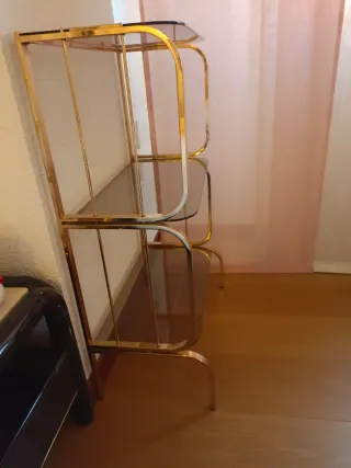 Elegante estantería con un diseño moderno y sofisticado. - Estructura metálica en acabado dorado. - Tres baldas de cristal ahumado. - Patas curvas que aportan estabilidad y estilo.