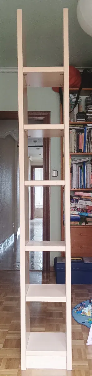 Estantería alta y estrecha, perfecta para organizar tus libros y objetos decorativos. Su diseño moderno y a la vez rustico se adapta a cualquier espacio. Esta en su embalaje original, completamente nueva, porque me equivoque en las medidas. Es buena y fuerte, mo como las de Ikea. No hago envíos. - Material: Madera - Color: Beige y marrón
