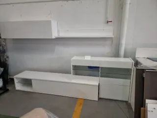 Conjunto modular de salón en color blanco, ideal para organizar tu espacio. Puede tener algunas marcas al estar en exposición - Diseño moderno y minimalista. - Acabado liso y brillante. - Incluye estanterías y módulos de almacenaje. Dudas llama o escribe al WhatsApp 641706334