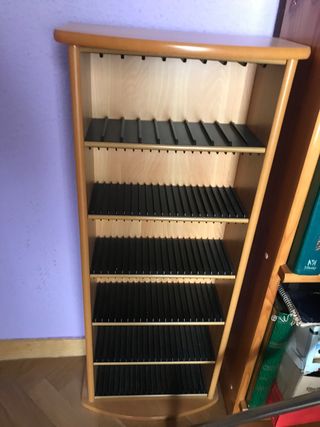 Estantería vertical con capacidad para almacenar CDs o DVDs. Su diseño permite organizar tu colección de forma ordenada. - Estructura de madera. - Bandejas de plástico negro.