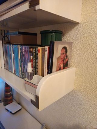 Estantería para CDs y DVDs en forma de cuarto de círculo, ideal para colocar en esquinas y aprovechar mejor el espacio. Capacidad para hasta 24 discos. Estructura metálica, estable y resistente.
