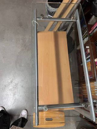 Elegante estantería de dos niveles con estructura metálica y baldas de cristal. - Diseño moderno y minimalista. - Ideal para baños o como expositor decorativo.
