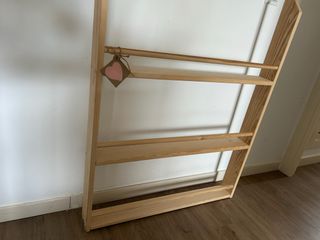 Estantería de bambú con un diseño de listones en cada nivel. - Estructura de madera. - Dos baldas inferiores. - Parte superior con barra para colgar.
