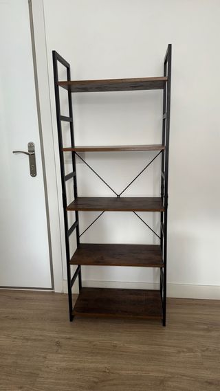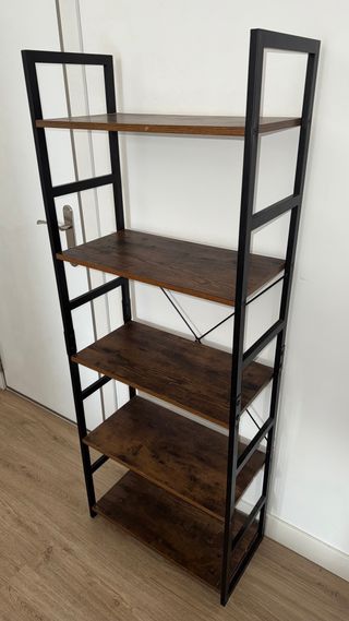 Estantería de diseño industrial con estructura metálica y baldas de madera. - Diseño de 5 baldas. - Combinación de metal y madera. Hola buenas tardes, mide 158 alto ( sumando la estructura metalica) x 60 ancho , 30 cm de fondo las maderas Esta en perfecto estado, puede tomarse alguna marquita en la madera , adjunto imagenes de las baldas
