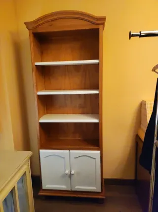 Estantería de madera con un diseño clásico y elegante. Perfecta para organizar tus libros o decoraciones. - Acabado en madera natural. - Puertas inferiores blancas con tiradores a juego. - Estantes amplios para almacenamiento.