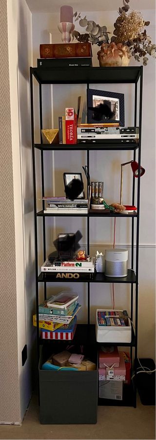 Estantería de almacenamiento con estructura metálica y detalles en plástico. - Color principal: negro.