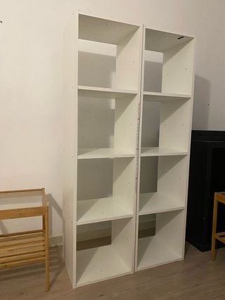 2 Estanterías modulares de la marca Leroy Merlin, ideal para organizar tus espacios. Recogida en Villanueva de la cañada, Madrid Ambas por 15€. Tienen algunos toques y pegatinas que se pueden quitar con alcohol. Altura 140 cm Ancho y fondo 35 cm - Diseño moderno y funcional. - Acabado en color blanco. - Fabricada en madera.