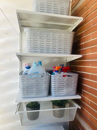 Estantería de plástico, de 4 niveles, con diseño esquinero y ruedas. Está como nueva, en perfecto estado.