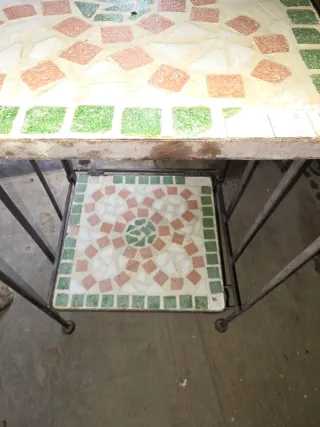 Estantería vintage con un diseño único de mosaicos. - Mosaicos de cerámica con detalles en verde y rosa. - Estructura de metal. - Diseño de tres niveles. Le faltan varios trozos de ceramico