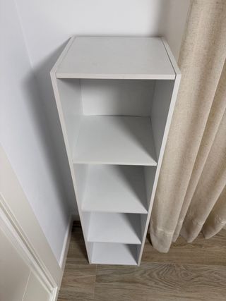 Estantería modular de color blanco, ideal para organizar tus pertenencias. - Se encuentra en buen estado, con un pequeño detalle en la esquina inferior. - Fabricada con materiales resistentes.