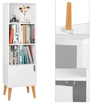 Estantería con un diseño moderno que combina dos acabados. - Una sección es de color blanco. - La otra sección es de madera. - Incluye una balda. - Medidas en las fotos.