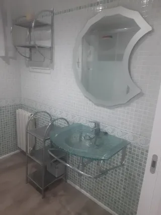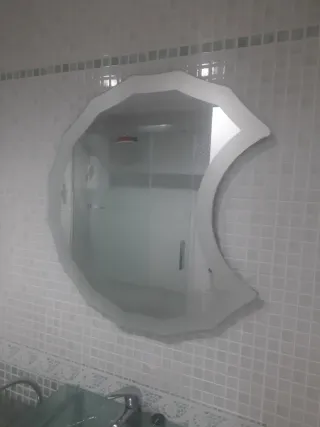 Conjunto muebles baño formado por espejo con forma de media luna 77'5 alto x 58'5 ancho. Lavabo cristal con grifo y toallero en la parte frontal (anchura 60'5). Se regalan estanterías metálicas: una colgada en la pared con 2 estantes y 2 toalleros (ancho 45 y alto 54 aprox) y la otra al suelo con 3 estantes (alto 85, ancho 33 y profundidad 36). Todo por 95e. Entrega en persona.