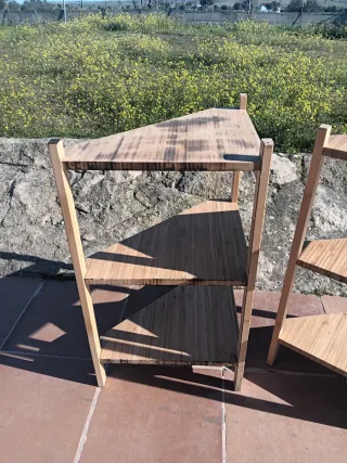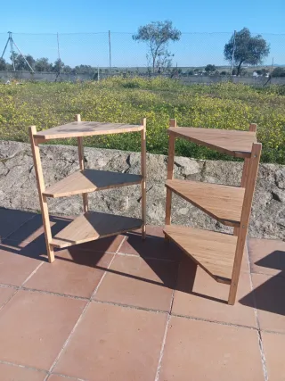Se venden dos estanterías triangulares de madera de Ikea. Han estado guardadas tiempo,serían para restaurarlas un poco - Diseño de esquina. - Estructura de madera. - Para bajo de lavabo o otras zonas