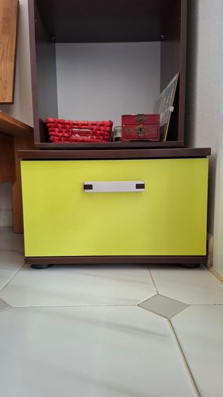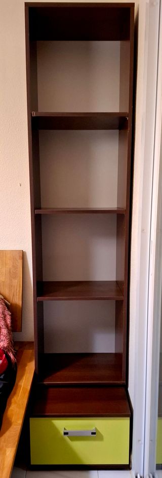 Conjunto de estantería y mueble cajón. - Estantería de madera oscura. - Mueble cajón de color verde y marrón a juego . El cajón es a parte , se puede usar de mesita de luz. La estantería no necesariamente va arriba. La estantería tiene fondo gris . No es hueca. Madera masiva, sólida. Las tablas son de 1, 7cm. Cajón con deslizamiento suave y sedoso . Un placer abrirlo! Cajón 18,50cm más profundo que la estantería. Comprado en confitada Esta en Riviera del Sol