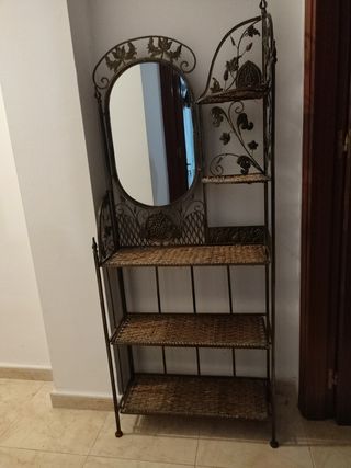Elegante estantería de forja con un espejo ovalado integrado. Perfecta para añadir un toque decorativo y funcional a cualquier espacio. - Estructura de metal forjado. - Espejo ovalado. - Múltiples baldas para almacenamiento. - Diseño ornamental.