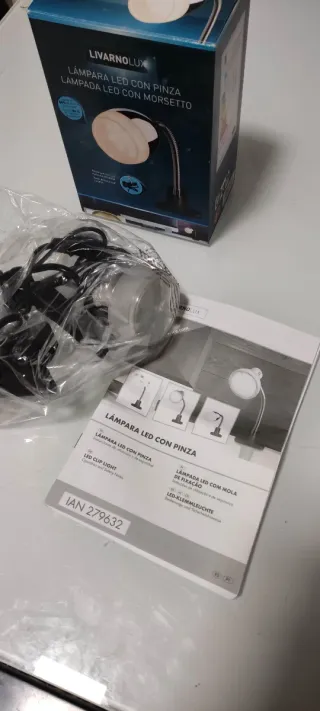 Lámpara LED de Livarnolux con un diseño moderno y funcional. - Ideal para sujetar en escritorios o estanterías. - Fabricada en metal y plástico.