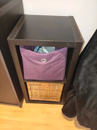 Urge. Se separa Conjunto de mueble para televisión (120*130)y dos estanterías una de suelo alta (105*191) y otra pequeña para colgar(la que aparece en la foto con un cajón de tela morado y de mimbre es en horizontal)(76*40)) - Estructura principal en color marrón-negro oscuro. - Diseño moderno y funcional. Tiene algún desperfectos pero se puede cubrir con edding negro