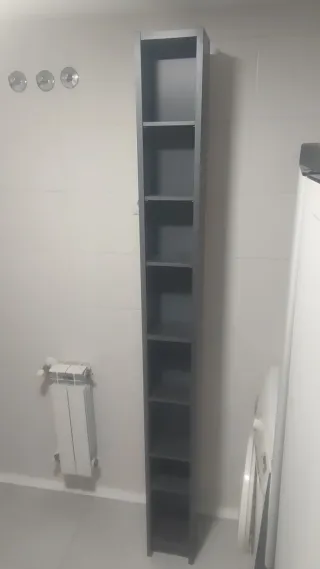 Estantería de estilo librería, ideal para organizar tus libros y objetos. - Estructura de metal resistente. - Paneles de madera. 8 baldas ancho 56 cm y 14 de fondo Sujeción directa a pared. Recoger en Alcorcón