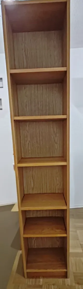 Estantería de madera con un diseño clásico y elegante. Ideal para organizar libros, decoraciones y otros objetos. - Fabricada en madera de alta calidad. - Color marrón natural. - Con cinco baldas para almacenamiento. - Tiene un rasguño tal y como se ve en la foto. Solo venta en persona. Imprescindible venir a recoger.