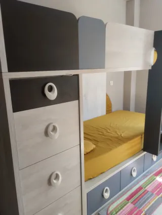 Litera funcional con diseño moderno y práctico. - Cajones integrados para almacenamiento. - Estantería lateral para libros o decoración. - Acabado en beige y gris.