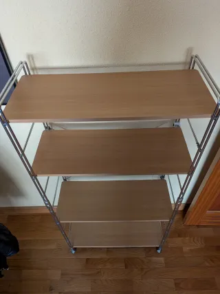 Conjunto de estantería y escritorio en buen estado. - Estantería con varias baldas. - Escritorio con ruedas para fácil movilidad.