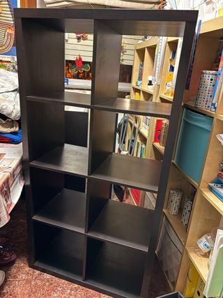 Mueble de estantería de la marca IKEA, ideal para organizar tu espacio. - Diseño modular con compartimentos. - Acabado en color negro y detalles en gris. - Fabricado con materiales resistentes.