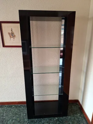 Elegante estantería con estructura de madera lacada en negro y baldas de cristal. - Diseño moderno y minimalista. - Acabado en negro brillante. - Tres baldas de cristal. 2 unidades.
