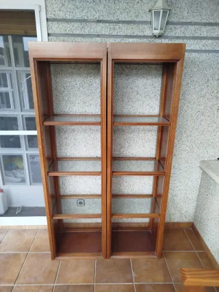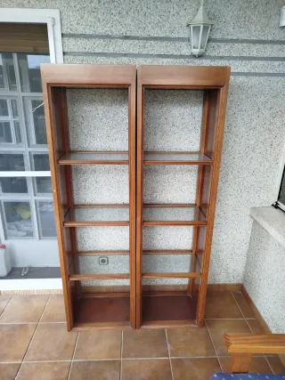 Conjunto de dos estanterías de madera con baldas de cristal. - Estructura de madera. - Baldas de cristal.